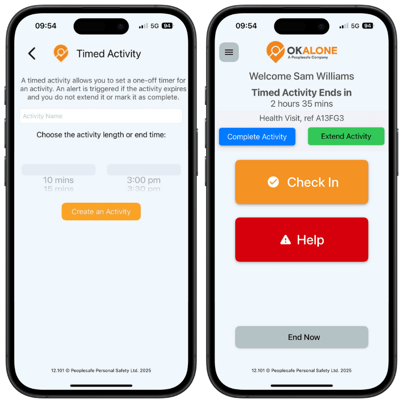 Timed Activity is a flexible feature within the OK Alone app that lets lone workers set a safety timer for high-risk tasks. Whether lifting heavy items, entering a client’s home, or working in a confined space, workers can start a countdown that will trigger an alert if they don’t confirm completion—adding an extra layer of protection when it matters most.