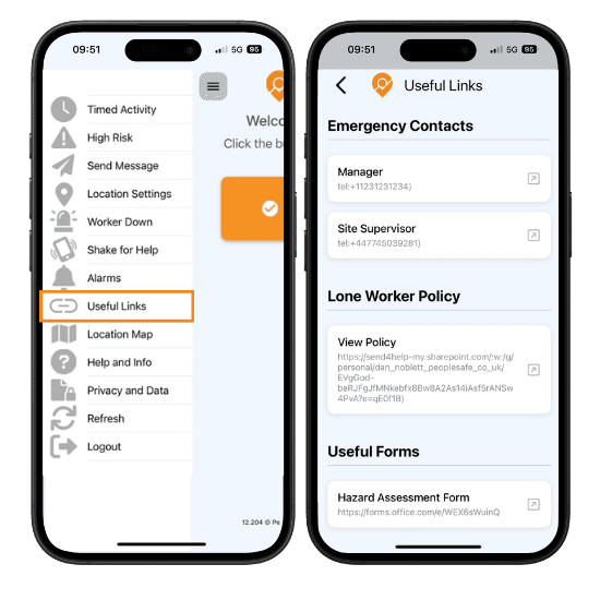 The Useful Links feature gives workers instant access to essential forms, contacts, and safety resources directly within the OK Alone app. Whether they need to report an incident, access safety procedures, or call an emergency number, everything is just a tap away, according to what you feel is essential.