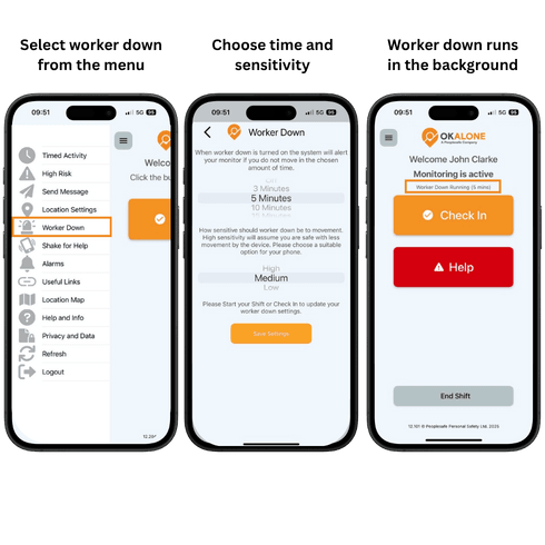 Worker Down is an automated safety feature within the OK Alone app that detects when a worker has stopped moving for a set period of time. Designed specifically for lone workers who may be unable to call for help, it triggers an alert to supervisors so action can be taken quickly, even when the worker is unresponsive.
