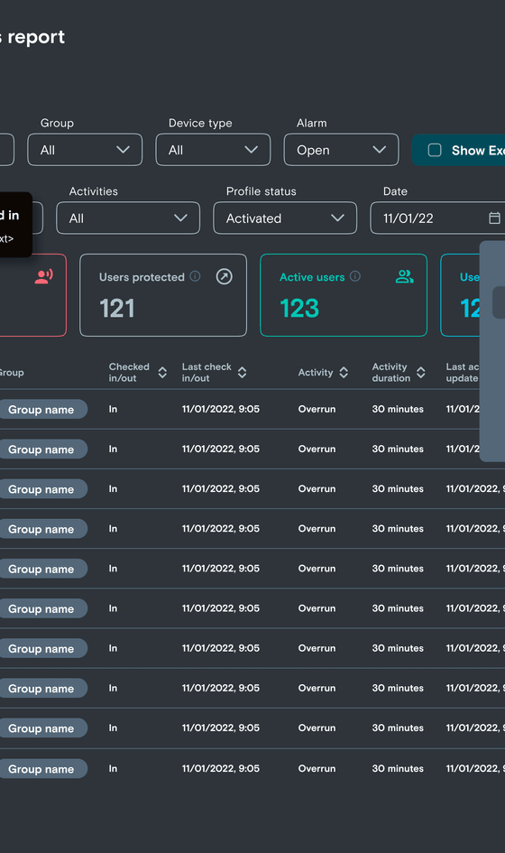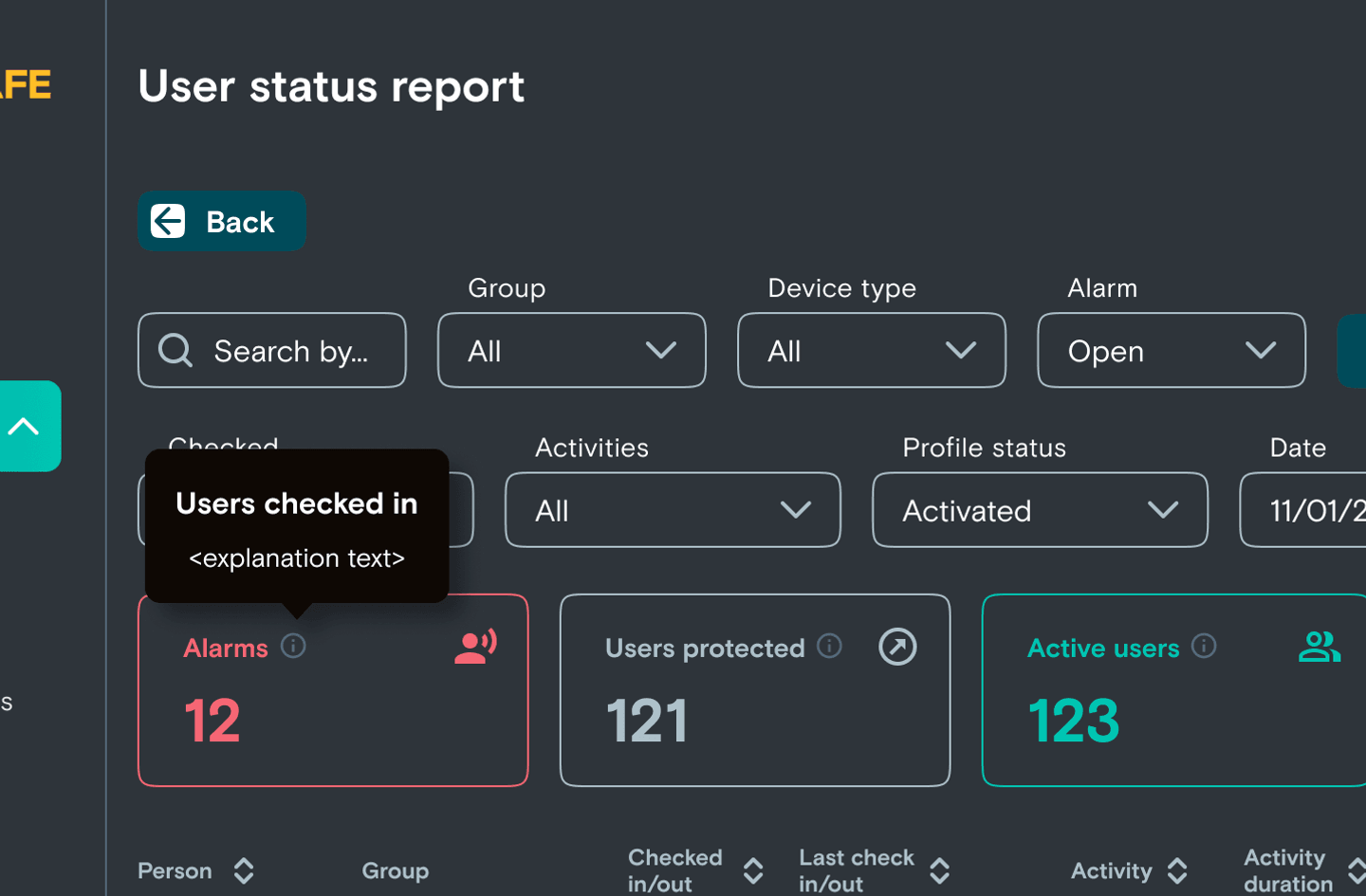 Detail in the table will show the status broken into 3 main categories: Check in/out, Timed Activities, and Alarms. This aims to show you who is working, who is completing high-risk activity, and who is currently in an emergency.